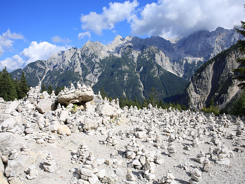 After leaving the hut you start on a very mineral route, where you go up and down through scree slopes. You go up towards the north of the massif to reach the hut at the foot of the Triglav massif.