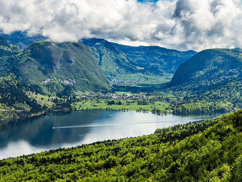 – The aerial view of Lake Bohinj from Vogel.